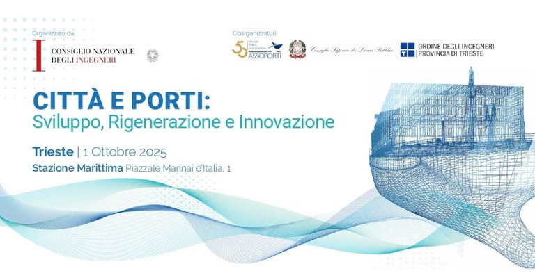 Si terrà il 1 ottobre presso la Stazione Marittima di Trieste l'evento CITTÀ E PORTI: Sviluppo, Rigenerazione e Innovazione, organizzato dal Consiglio Nazionale degli Ingegneri in collaborazione con Assoporti, il Consiglio Superiore dei Lavori Pubblici e l’Ordine degli Ingegneri della Provincia di Trieste.